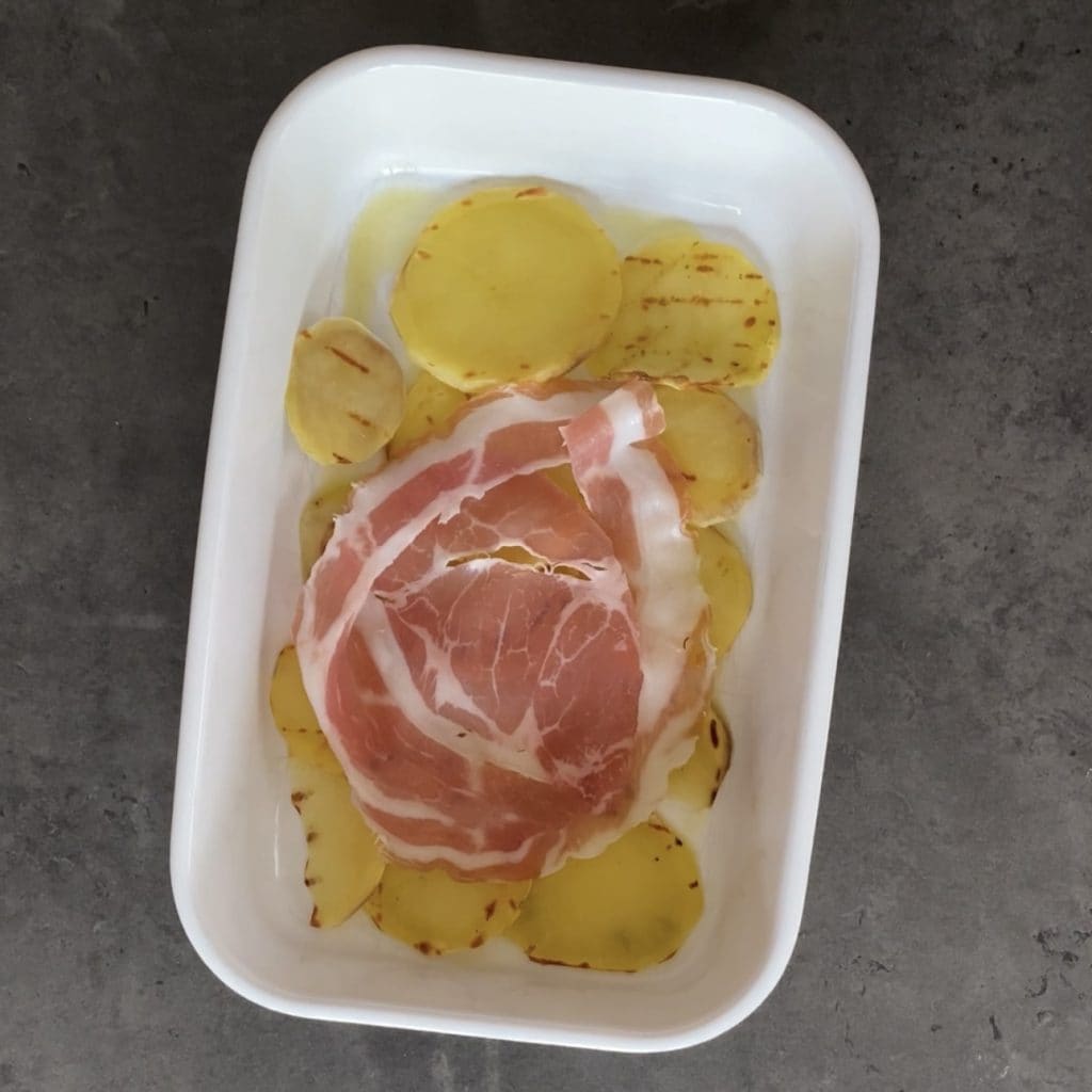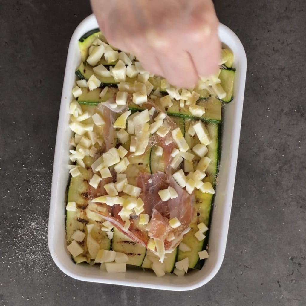 y una loncha de panceta, proceder de esta manera hasta terminar las verduras asadas y completar todas las capas.