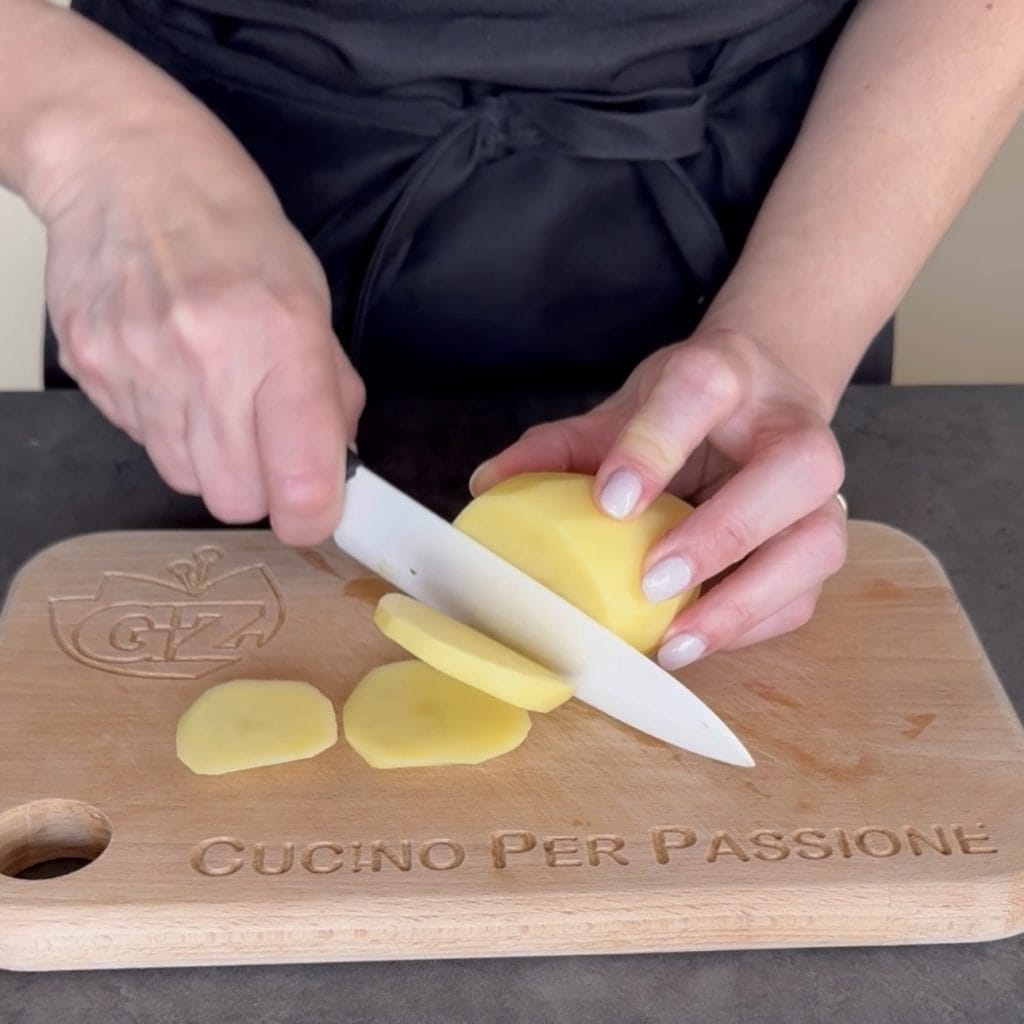 Pelar las patatas, lavarlas y cortarlas también en rodajas finas.