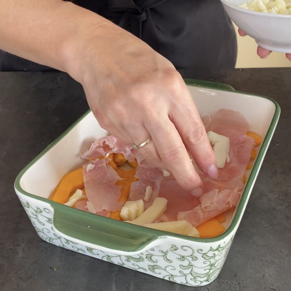 • Ahora que habéis hecho la primera capa, cubrid con más rodajas de calabaza y continuad como antes rellenando el pastel de calabaza, haced las capas hasta completar la bandeja.