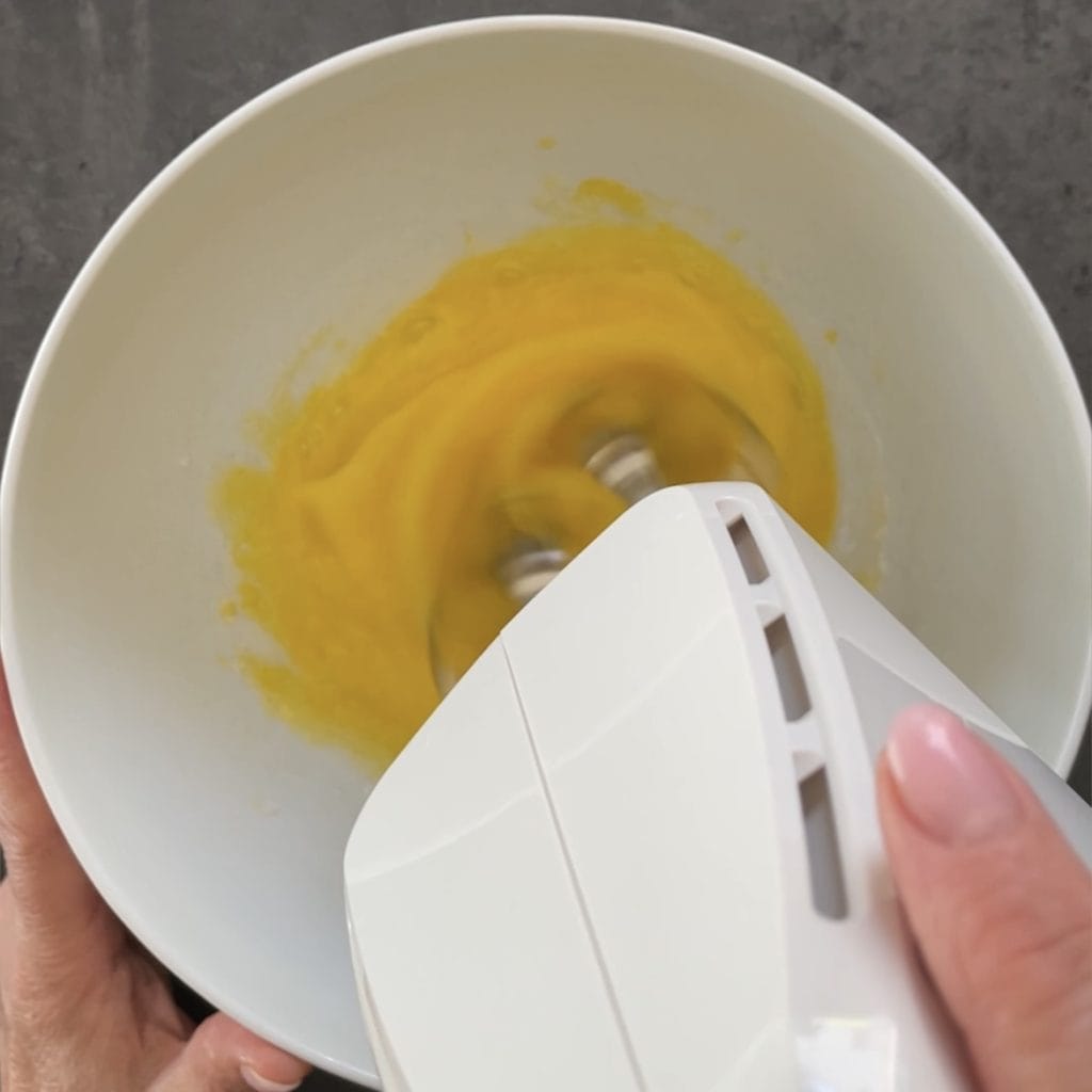 Siempre con las batidoras eléctricas en funcionamiento añade el aceite de semillas de girasol en hilo, el jugo de la piña en almíbar, una pizca de sal y sigue trabajando todo con las batidoras.