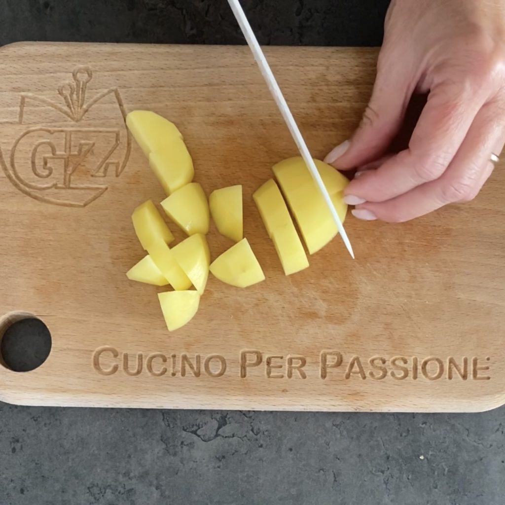 • Comenzamos a preparar las Patatas y speck al horno con cebolla, pelad las patatas