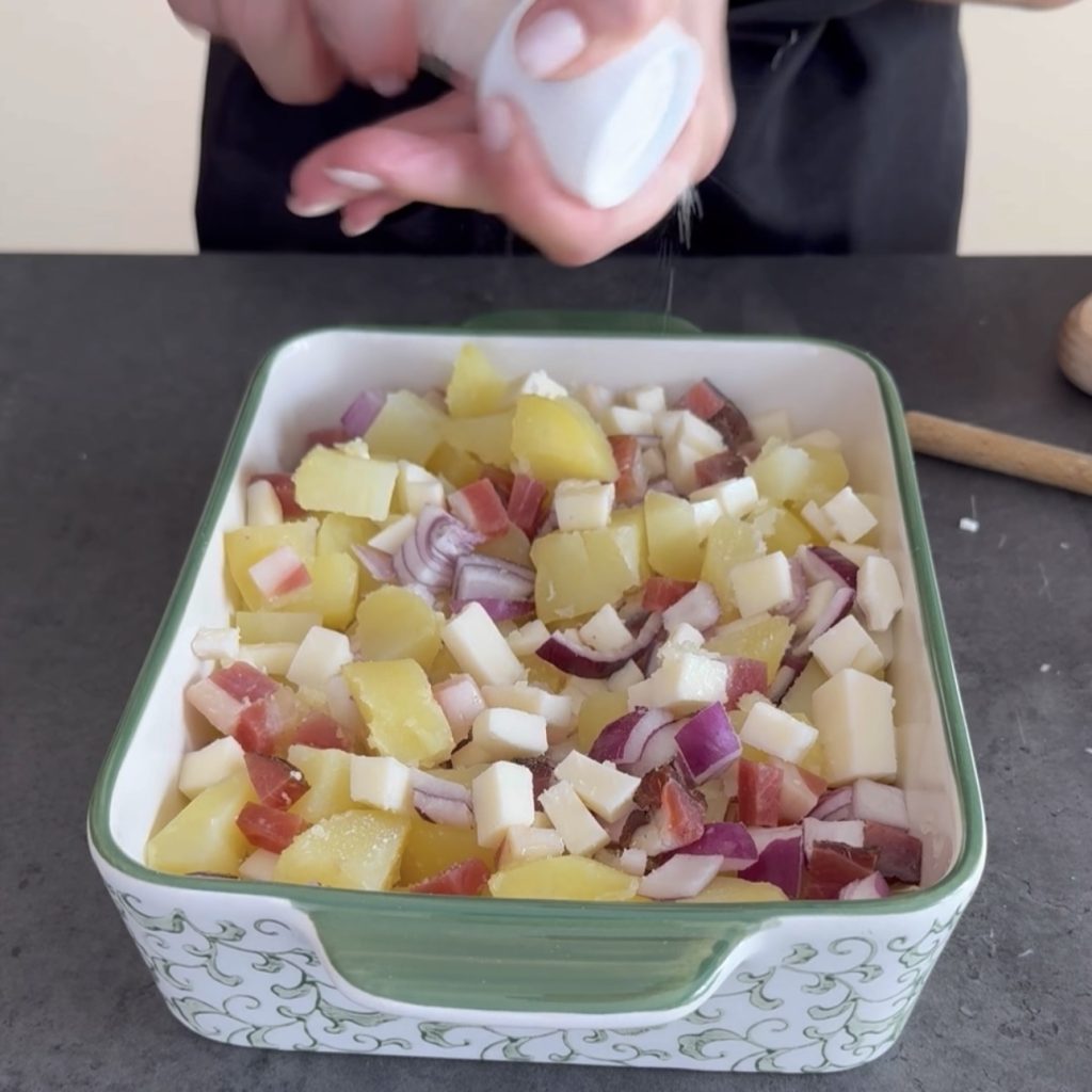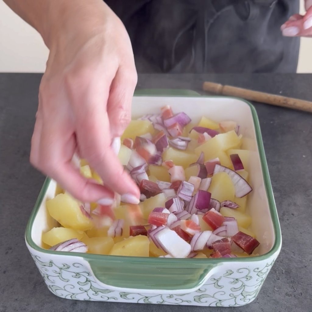 Patatas y speck al horno con cebolla un plato único fácil de hacer y que una vez probado repetiréis muchas veces. Las patatas con el speck y la cebolla las podéis preparar tanto con el speck cortado en cubitos como hice yo, como con las lonchas finas de speck y luego cortado en tiras, yo prefiero sentir el speck más grande. A las patatas con speck he añadido también unos cubitos de mozzarella para pizza, alternativamente podéis usar queso ahumado como scamorza o provola o añadir queso de montaña. Ahora veamos cómo hacer las patatas y speck al horno y si las probáis hacédmelo saber. Barbara