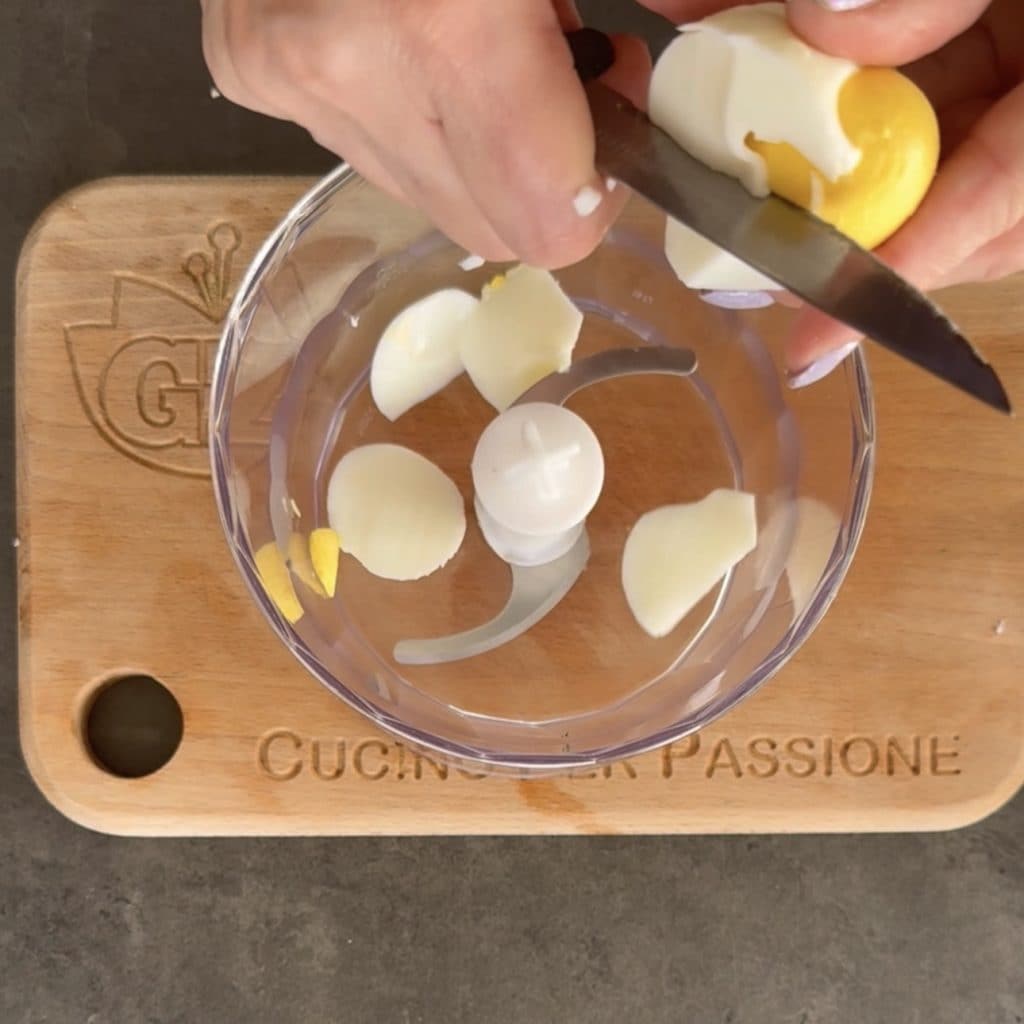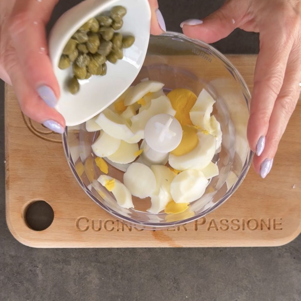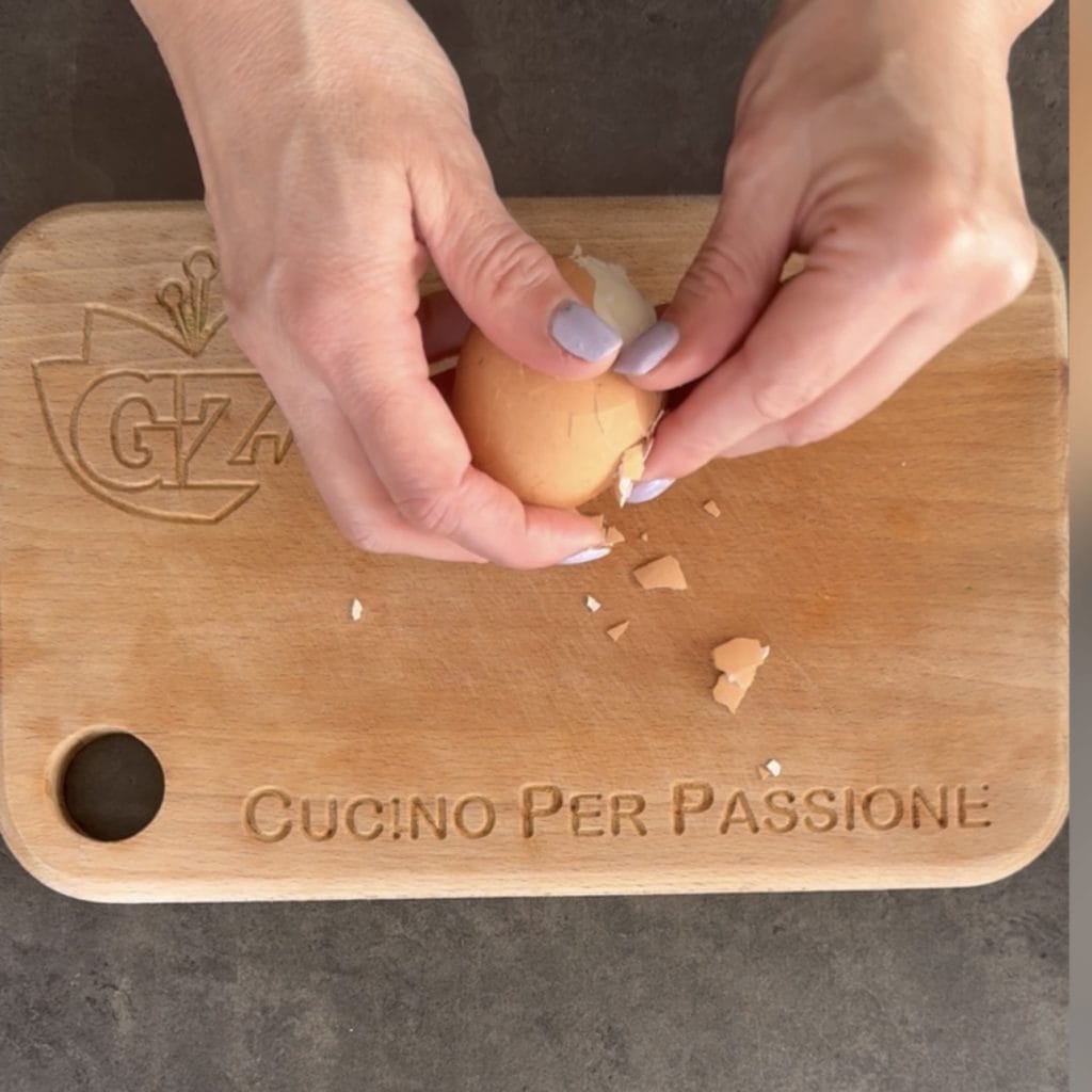 Empezamos a preparar el pavo tonnato, vierte en una olla agua y los huevos que deberán estar completamente cubiertos, ponlos al fuego y cocina durante 7 minutos desde el momento en que el agua empieza a hervir, luego pásalos bajo agua fría para que con el choque térmico los huevos se pelen perfectamente.