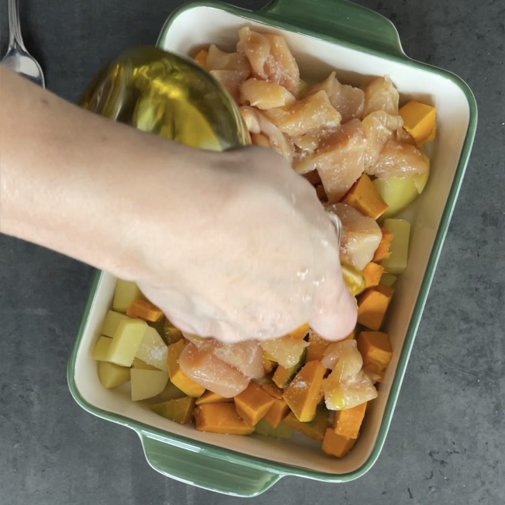 y mezcla bien para condimentar bien tanto la pechuga de pollo como las patatas y la calabaza.