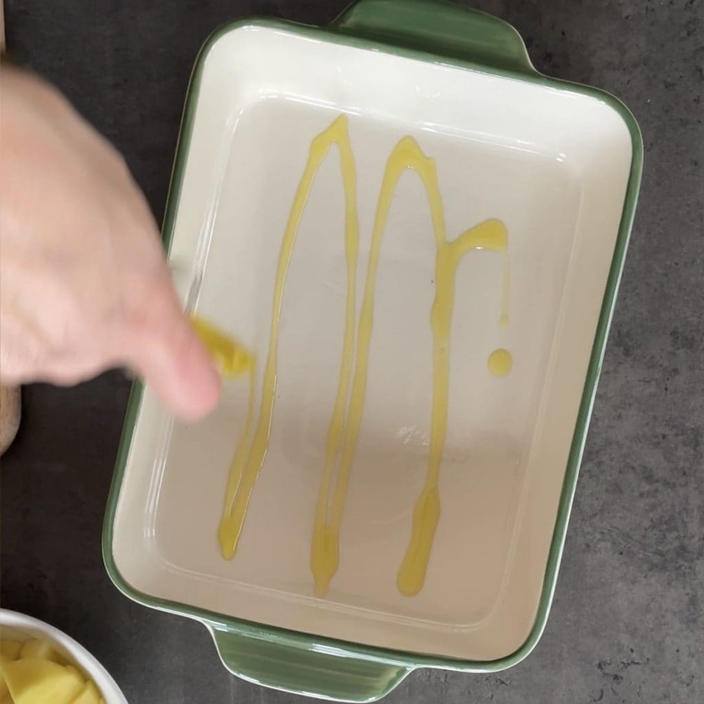 Vierte en la fuente para hornear un poco de aceite de oliva virgen extra,