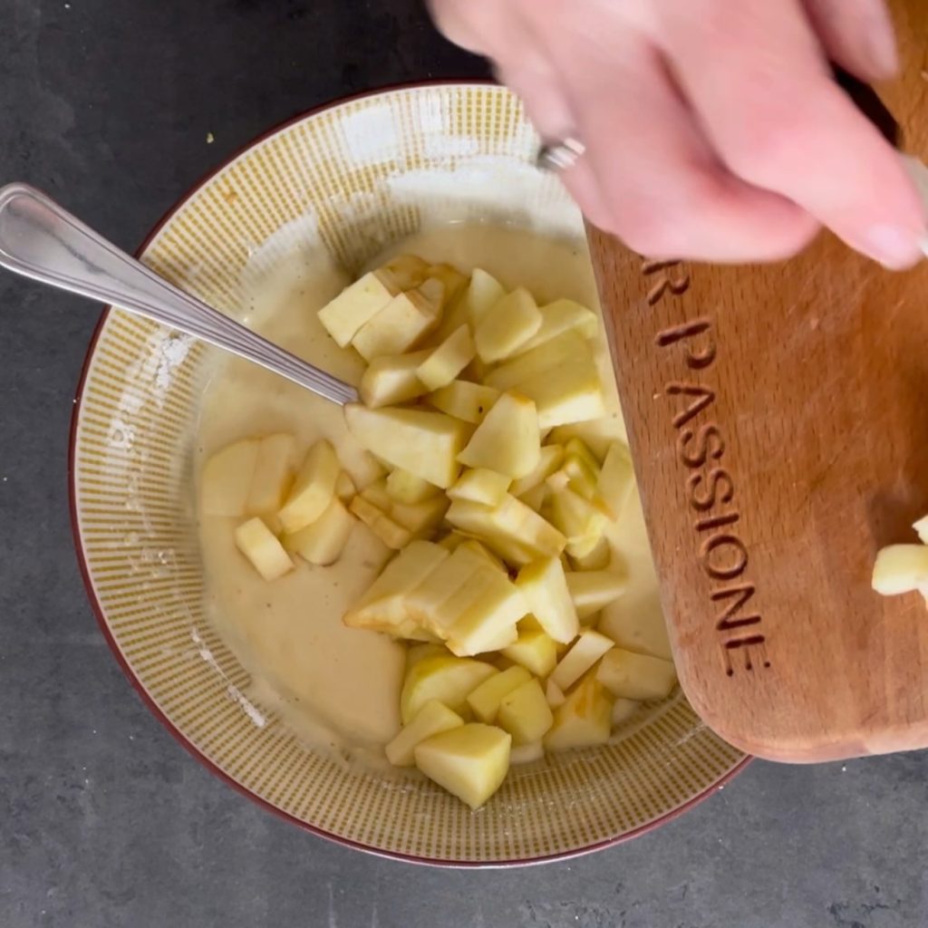 Cuando tengas una mezcla cremosa y sin grumos, añade las manzanas en cubos