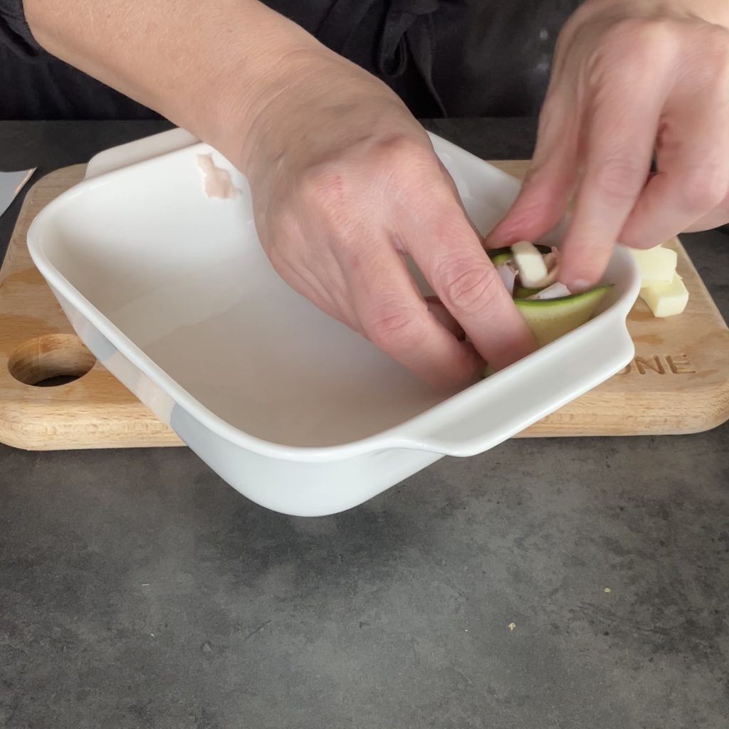 • Toma una rebanada de calabacín, coloca a lo largo el jamón