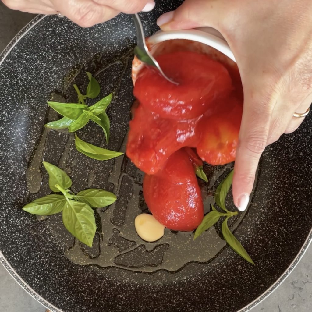 Empezamos a preparar los Rollitos de carne en salsa, vierte en la sartén aceite de oliva virgen extra, las hojas de albahaca y el diente de ajo,