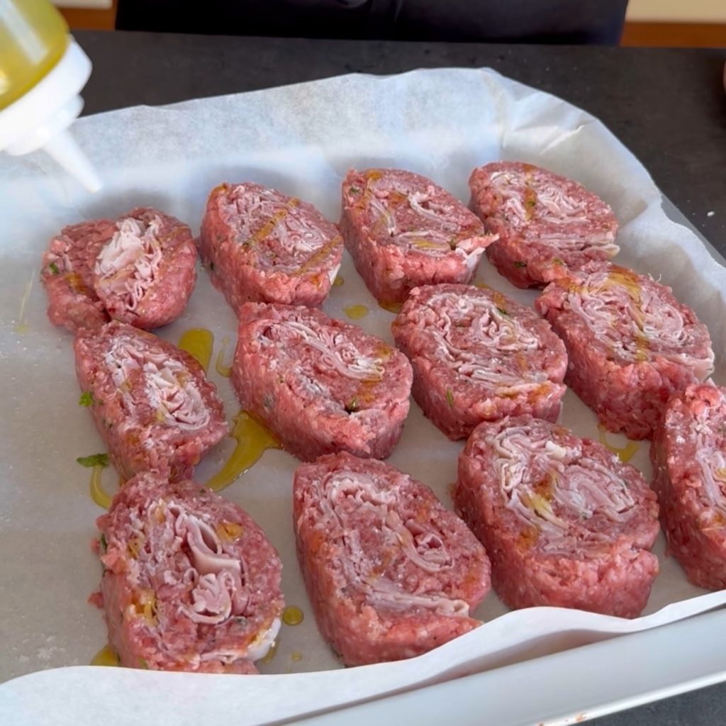 Después del reposo en la nevera, saca el rollo de carne picada y córtalo en rollitos de aproximadamente 2 cm
