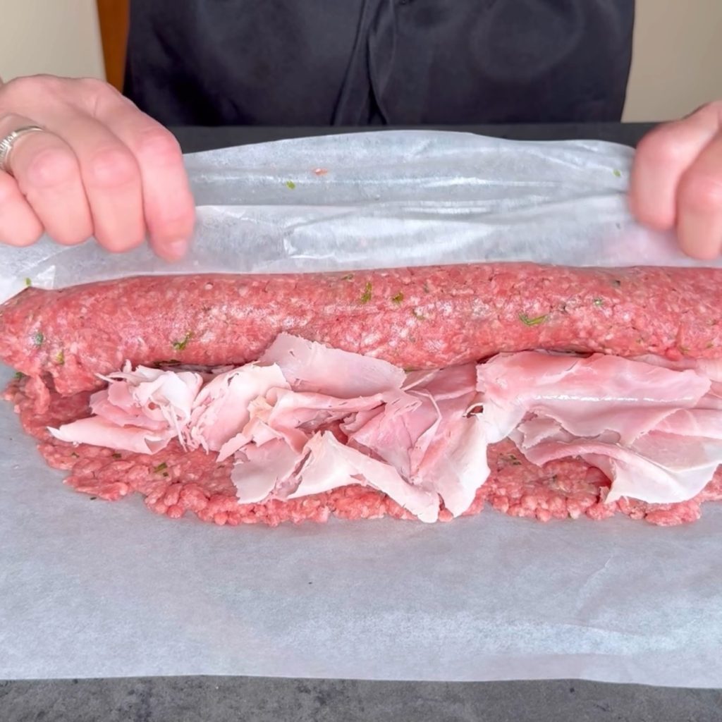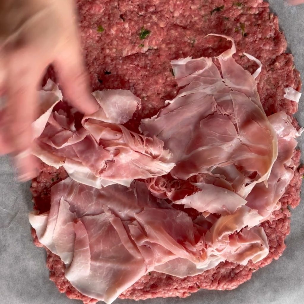 Distribuye el jamón cocido sobre toda la carne picada,