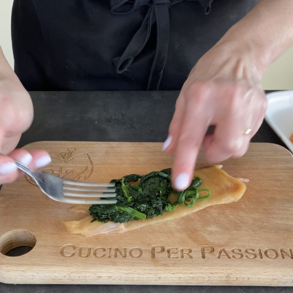 Tomad una loncha de pechuga de pollo, añadid las espinacas,