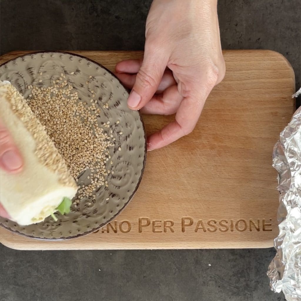 • pasa la parte con el queso para untar por las semillas de sésamo