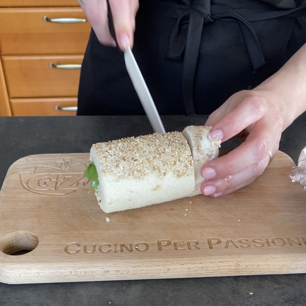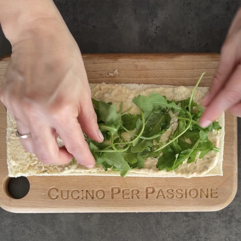 • Ahora enrolla la rebanada de pan comenzando por el lado donde tienes la rúcula,