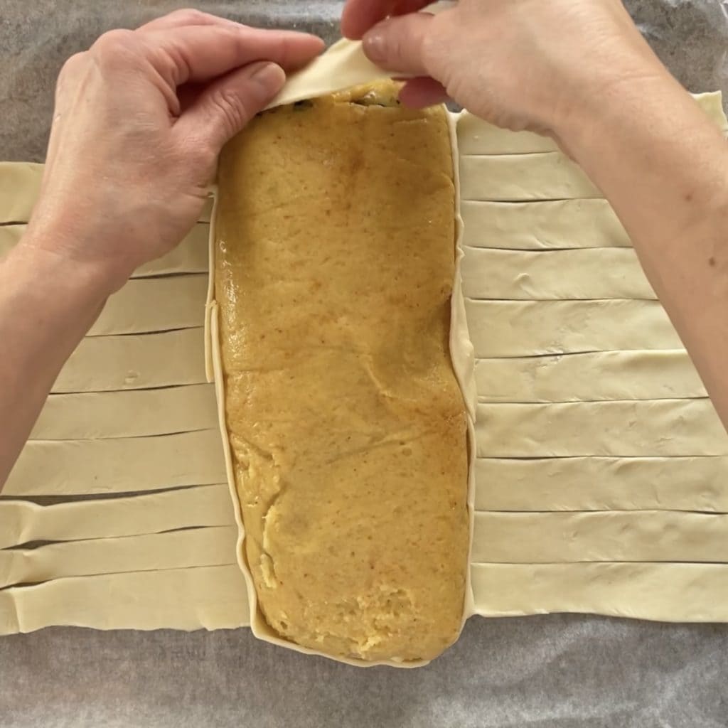 Desenrollad el hojaldre y colocad en el centro el rollo de patatas, en los laterales del hojaldre realizad incisiones con la ayuda de un cuchillo bien afilado en ambos lados, obtened tiras de 1 cm de ancho dejando sin cortar la parte central donde está colocado el rollo. Cerrad la parte superior e inferior y trenzad las tiras para cerrar y sellar bien.