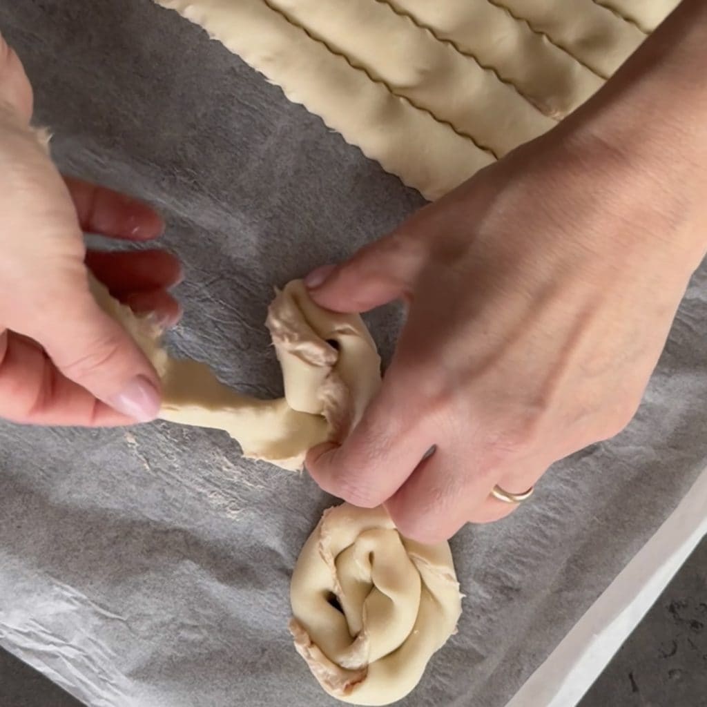• Toma cada tira, enróllala y ve dándole forma de espiral para formar los rollos.