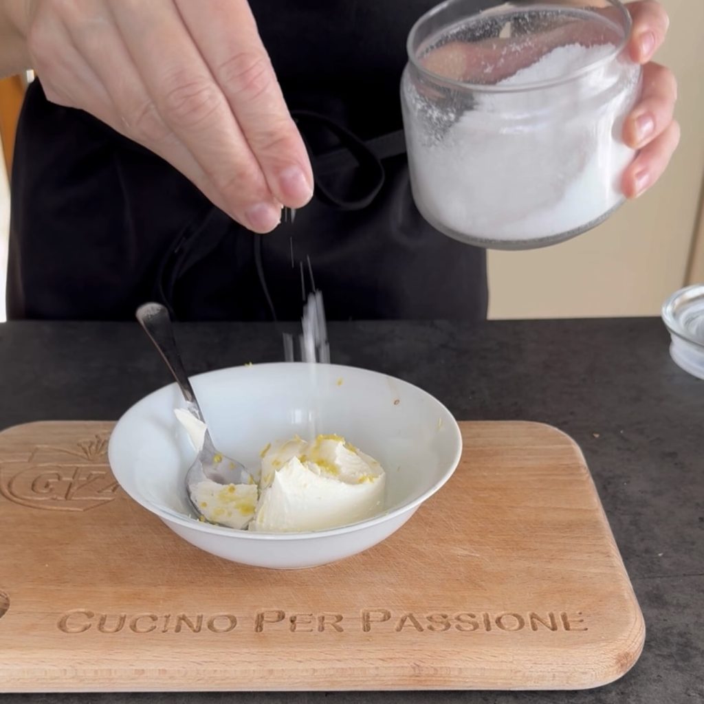 Empezamos a preparar la Rosa de salmón, un entrante sin cocinar, vierte el queso en un bol pequeño, añade el aceite de oliva virgen extra,