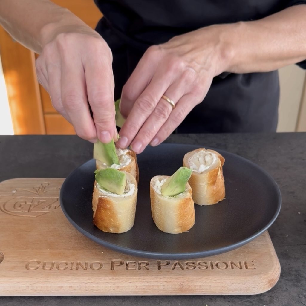 Corta el salmón ahumado en tiras y enróllalo para crear las rosas,