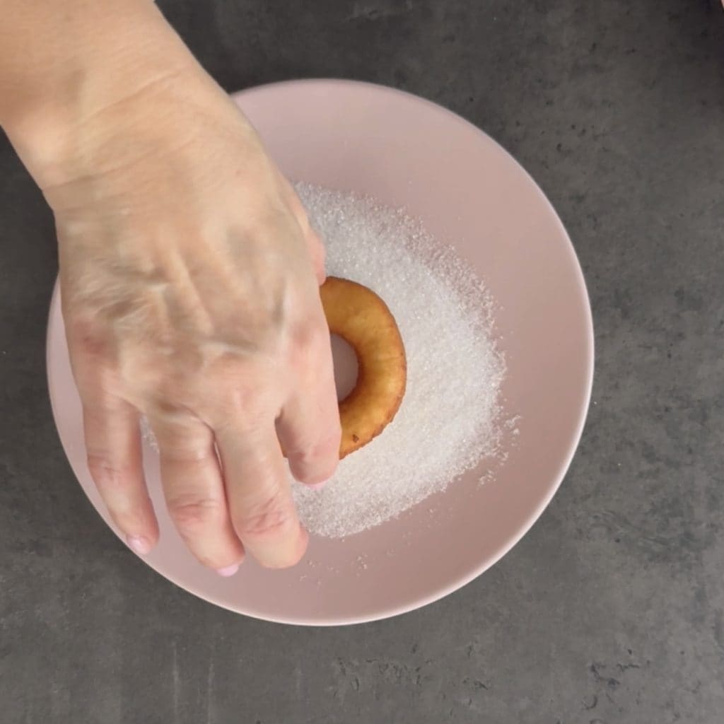 Ahora vierte el aceite de semillas de cacahuete en una olla y llévalo a una temperatura de 170/180°C, si no tienes termómetro haz la prueba con el mango de una cuchara de madera, si se forman burbujas alrededor significa que la temperatura es perfecta para freír la primera rosquilla. Usa el papel de horno donde está la rosquilla y coloca una a una las rosquillas en el aceite, verás que se despegarán solas del papel, elimina el papel y deja cocer las rosquillas, no frías demasiadas al mismo tiempo.