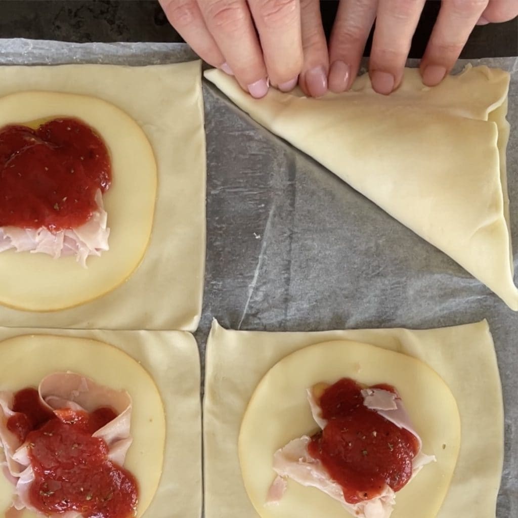 Dobla cada rectángulo recién relleno en triángulo y presiona bien con los dedos los bordes,