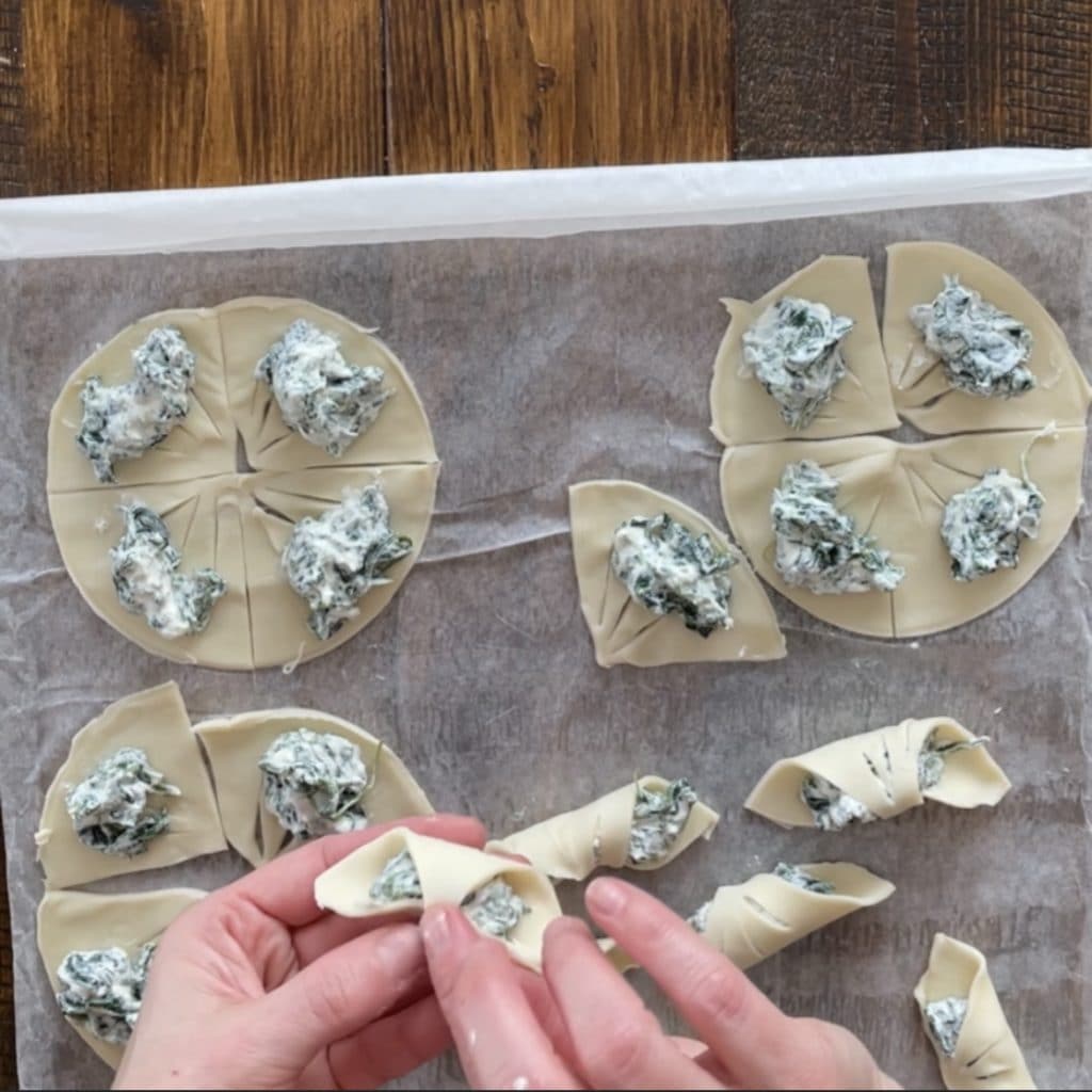 Con la ayuda de una cucharadita, coge un poco de relleno y colócalo en el borde de cada triángulo.