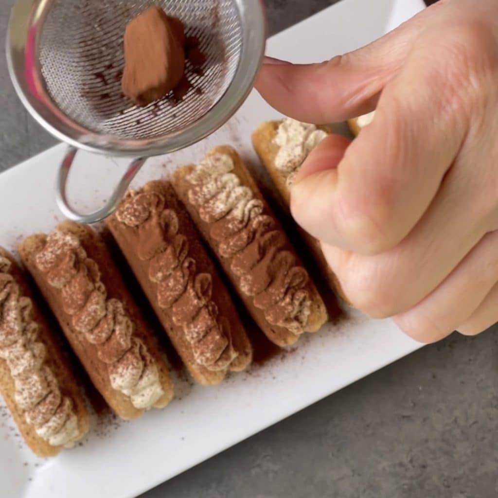 Transfiere la crema a una manga pastelera, toma un savoiardo y añade la crema de café,