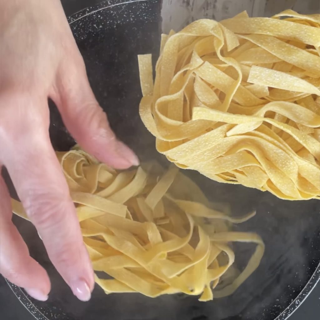• Echad agua en una olla, llevad a ebullición, añadid sal, y echad las tagliatelle que cocinaréis durante 2 minutos, estarán muy al dente, pero la cocción luego deberá continuar en la sartén.
