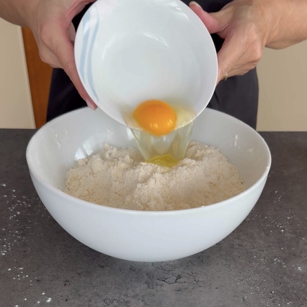 Comenzamos a preparar la Tarta de almendras, primero preparamos la masa quebrada, pueden usar la batidora, una licuadora o amasar a mano. Vierten en el bol la harina y el azúcar,