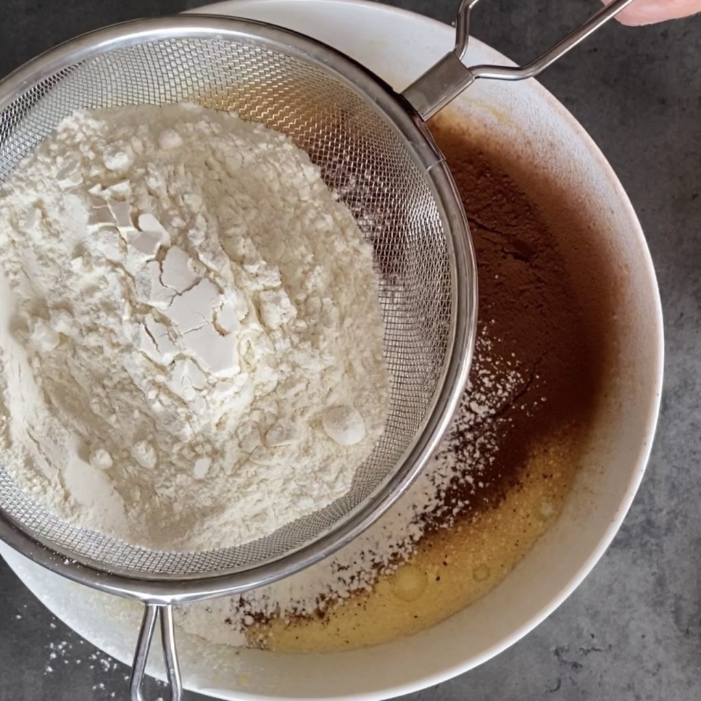 Engrasa y enharina el molde y vierte la mezcla de la tarta de chocolate,