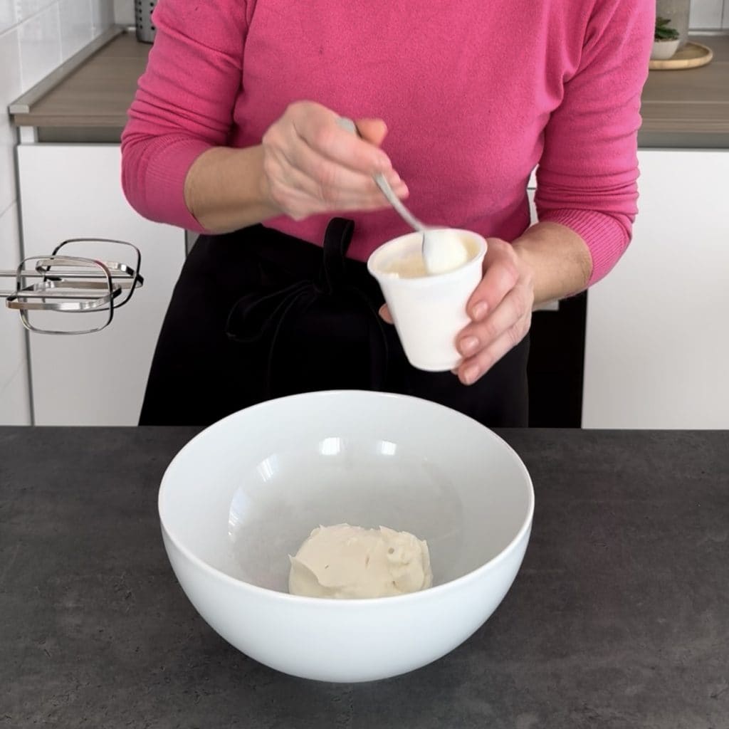 vertimos la mitad de la crema de yogur y mascarpone y la nivelamos,