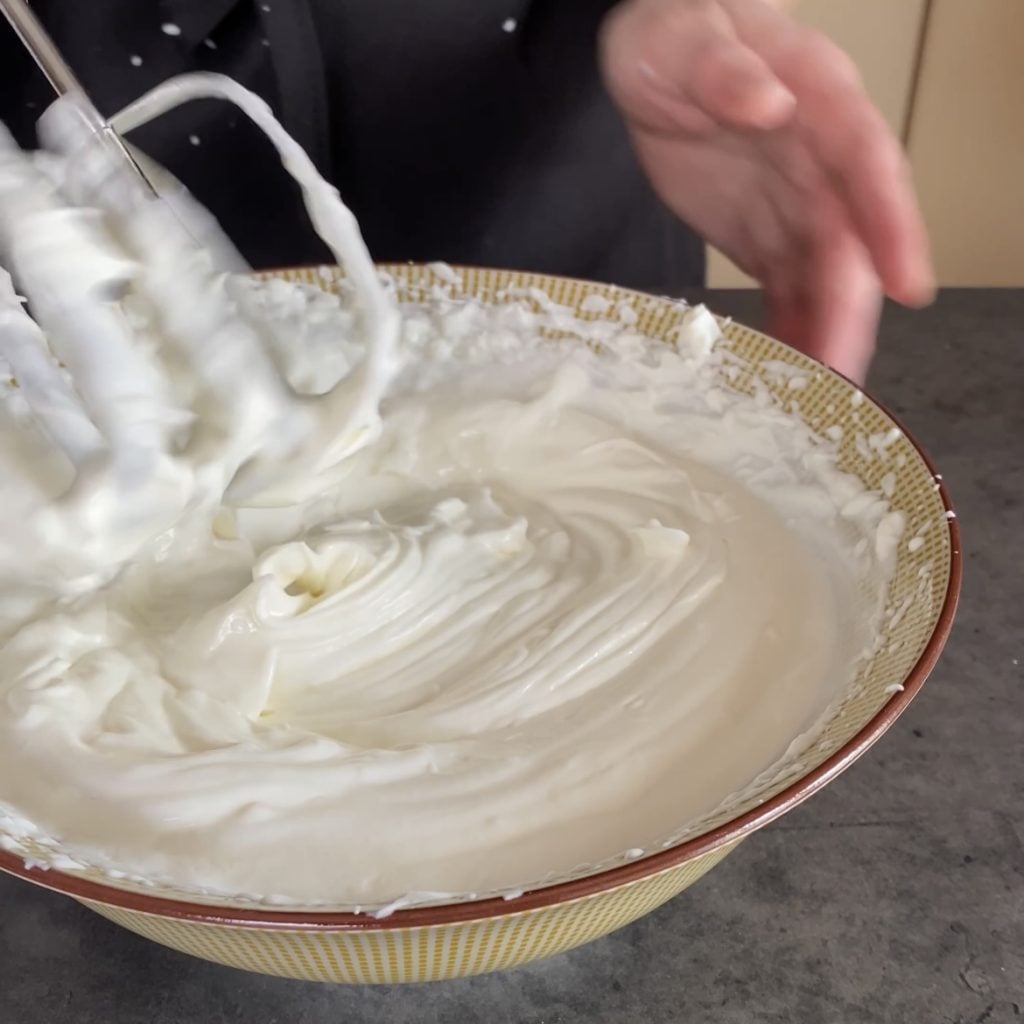 Añade la mitad de la crema de mascarpone y yogur y distribúyela sobre los pavesini,