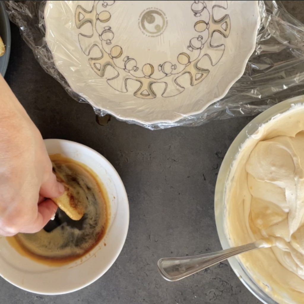 Forra el molde con film transparente, así podrás cubrir bien la tarta y será más fácil desmoldarla. Pasa los pavesini por el café,