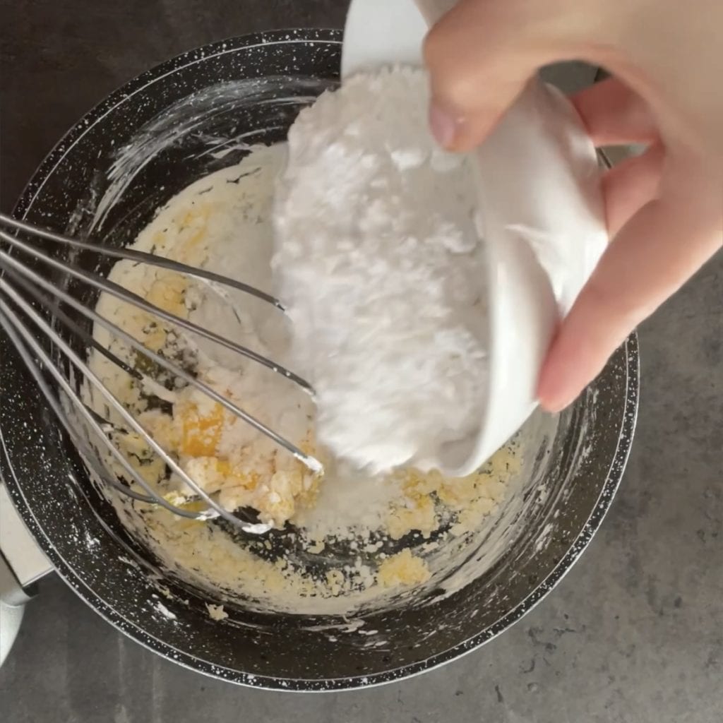 Añade luego el almidón de maíz, mezcla todo siempre con la varilla