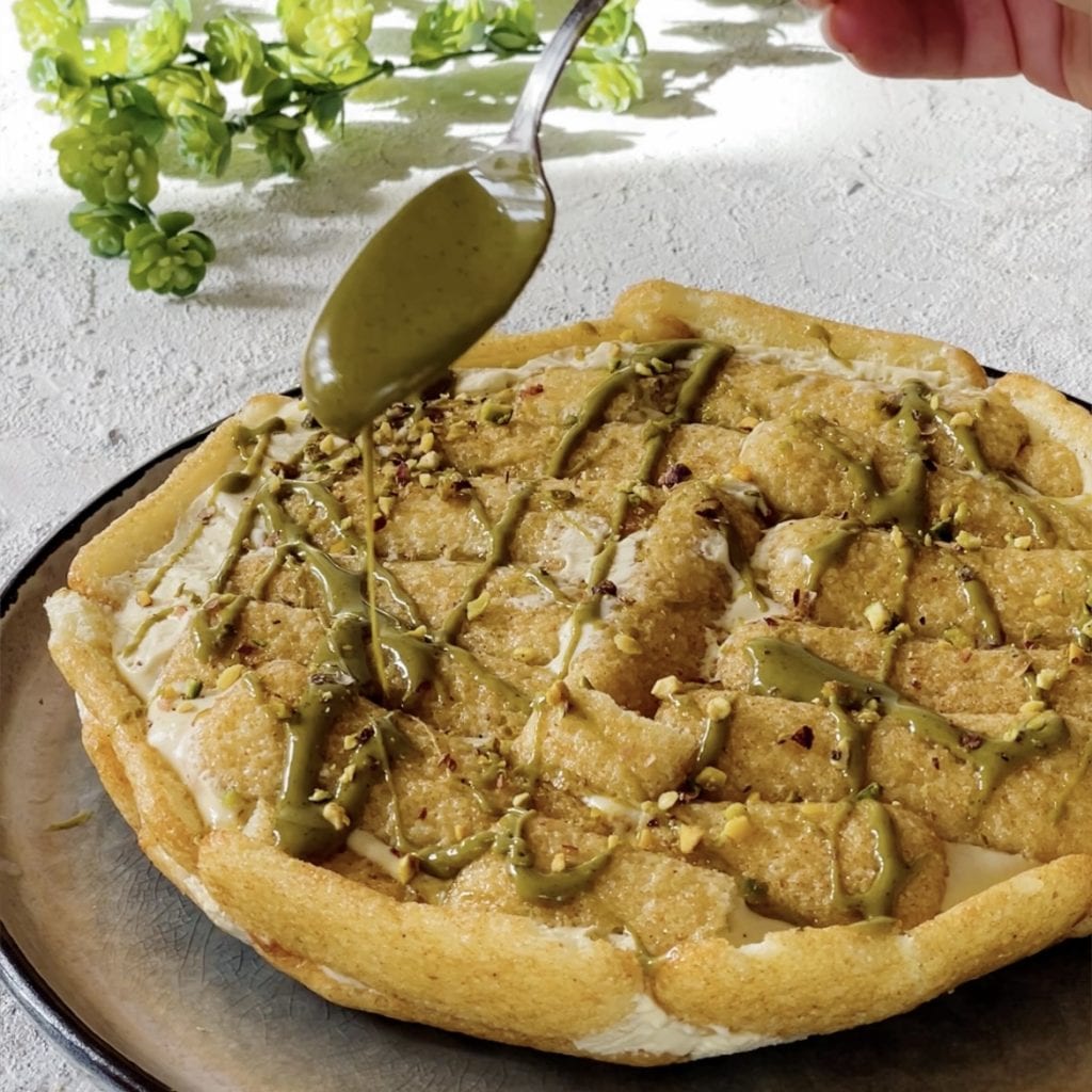 Antes de servir, añade en la superficie crema de pistacho y granillo de pistacho,