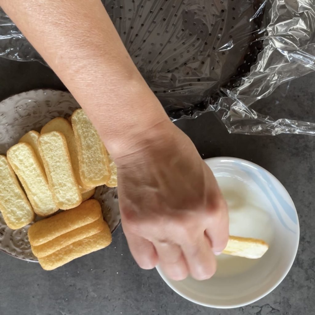 Forra con papel film el molde y déjalo abundante para que luego se pueda superponer para cerrarlo. Sumerge los pavesini en leche fría
