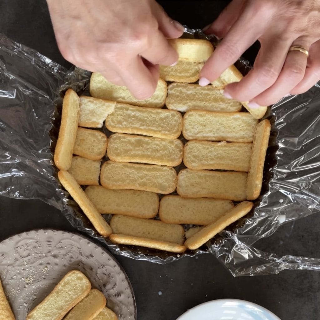 cubre la crema con más pavesini siempre empapados en leche, cubre los espacios vacíos con pavesini rotos.