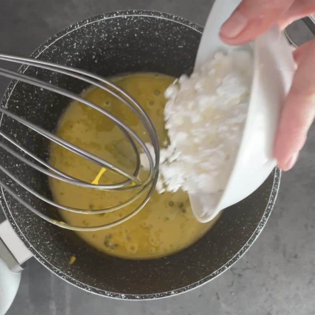 Añade la leche poco a poco y mezcla con la varilla para que los ingredientes se integren bien y obtengas una mezcla sin grumos.