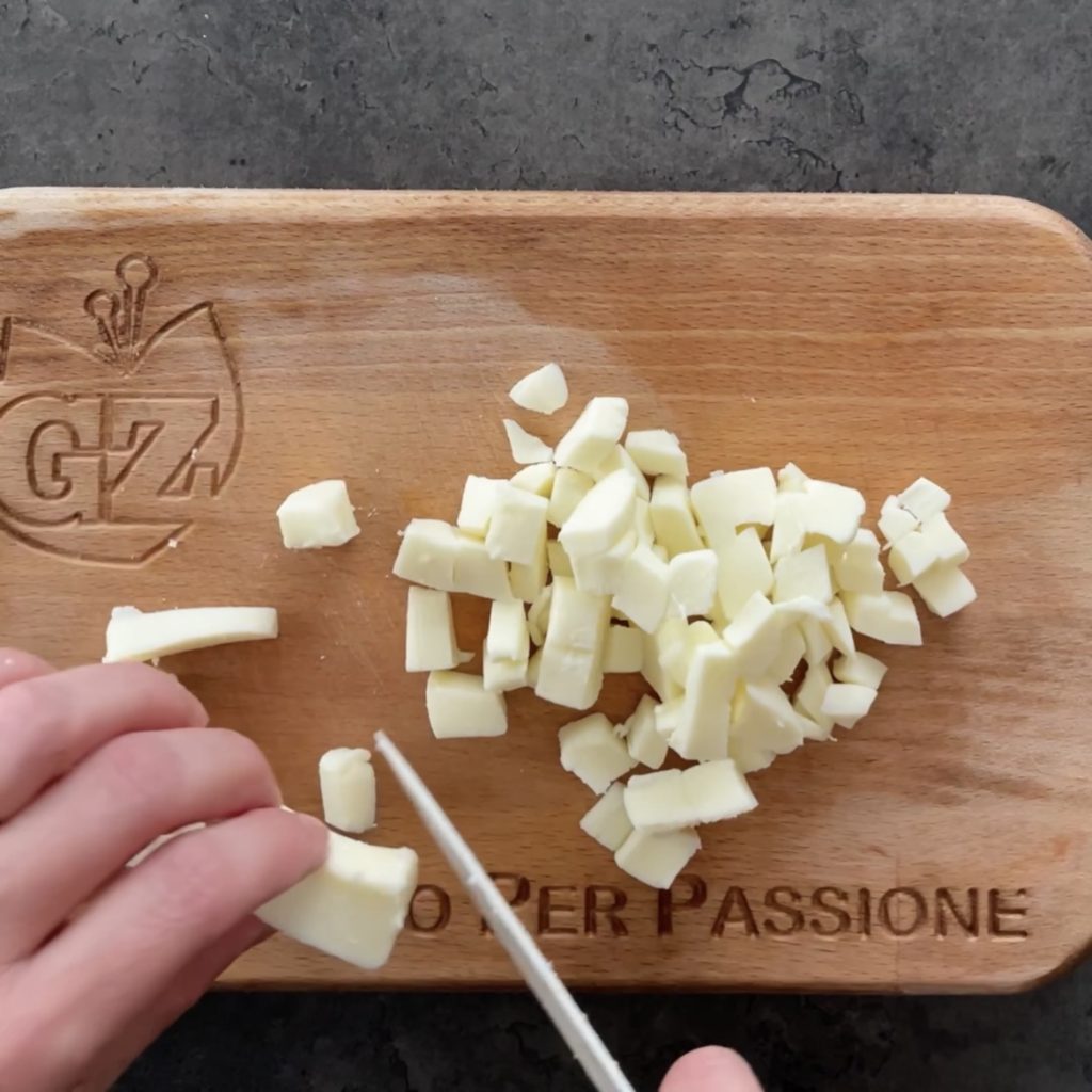 • Mientras los puerros se cocinan, corta el queso en pequeños trozos