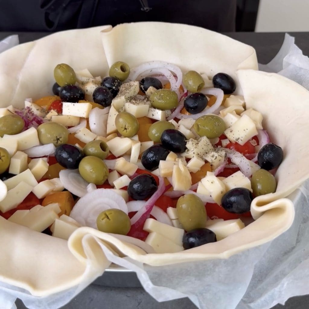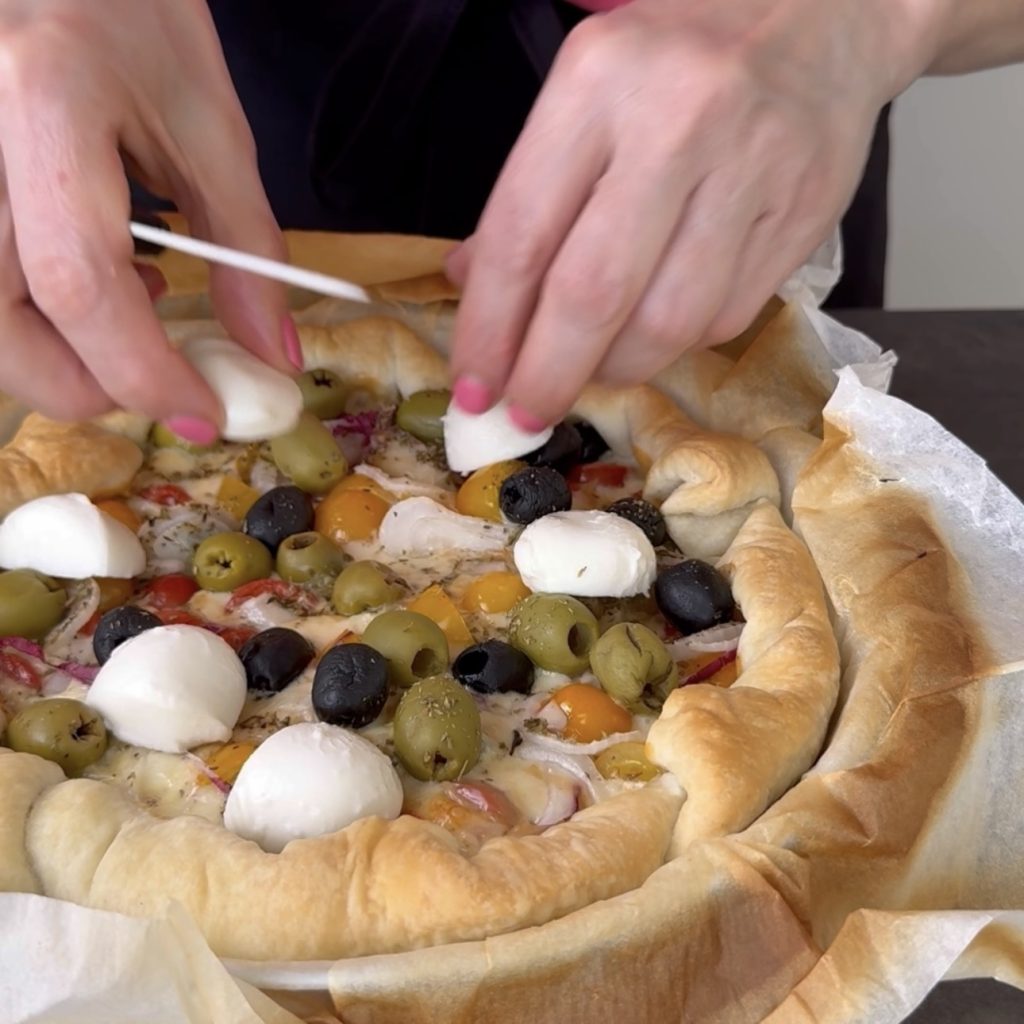 Tarta salada con tomatitos y scamorza una tarta salada sencilla y sabrosa, deliciosa tanto caliente como a temperatura ambiente, tiene pocos ingredientes pero son sabrosos y deliciosos. La tarta salada con tomatitos, cebolla y aceitunas es perfecta para servir como entrante o plato único, o para un aperitivo o un buffet. Podéis usar hojaldre redondo o rectangular, no importa para el buen resultado de la receta, como alternativa al hojaldre podéis usar masa quebrada. Ahora vamos a ver cómo preparar la tarta salada con tomatitos y scamorza, y si la probáis, decídmelo. Barbara