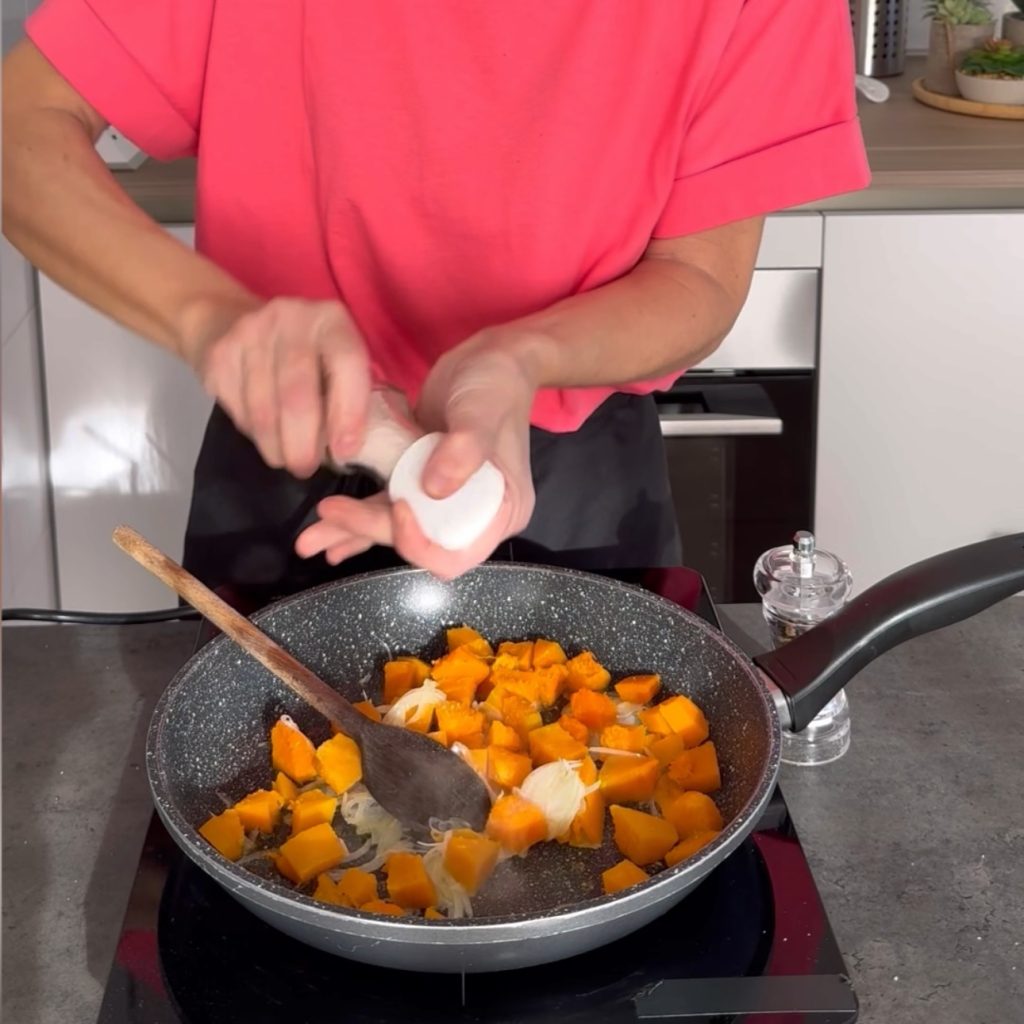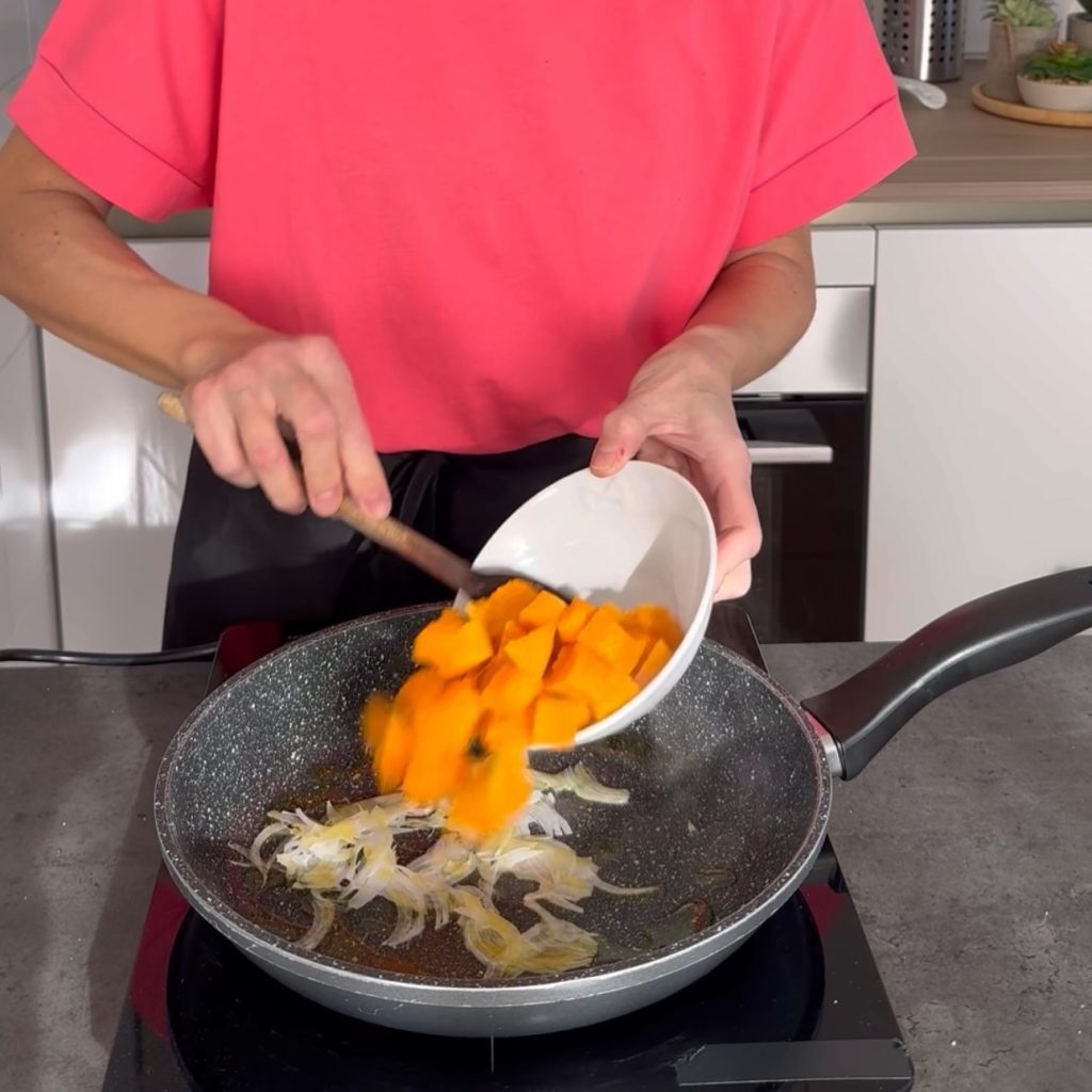 Empezamos a preparar la Tarta salada de calabaza y setas, pique finamente la cebolla, añada aceite de oliva virgen extra,