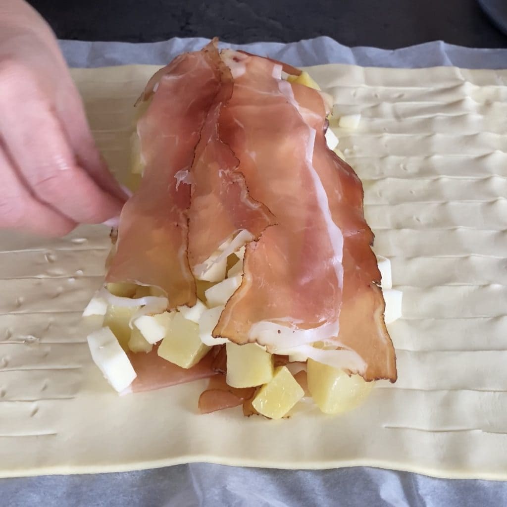 trenza las tiras para sellar bien la tarta salada speck y patatas
