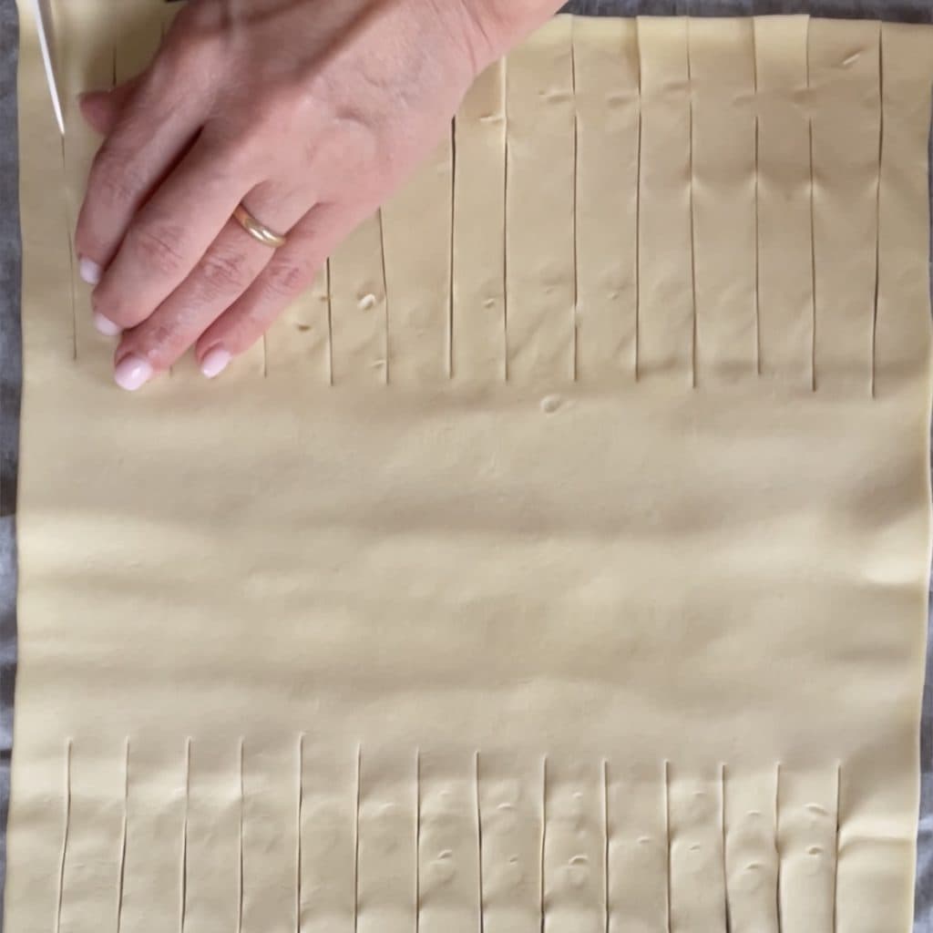 Toma la masa de hojaldre y corta en tiras de aproximadamente 1 centímetro las dos partes laterales.