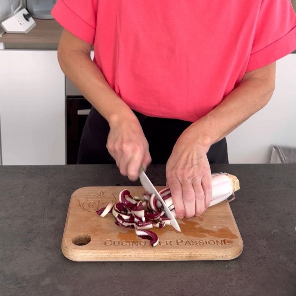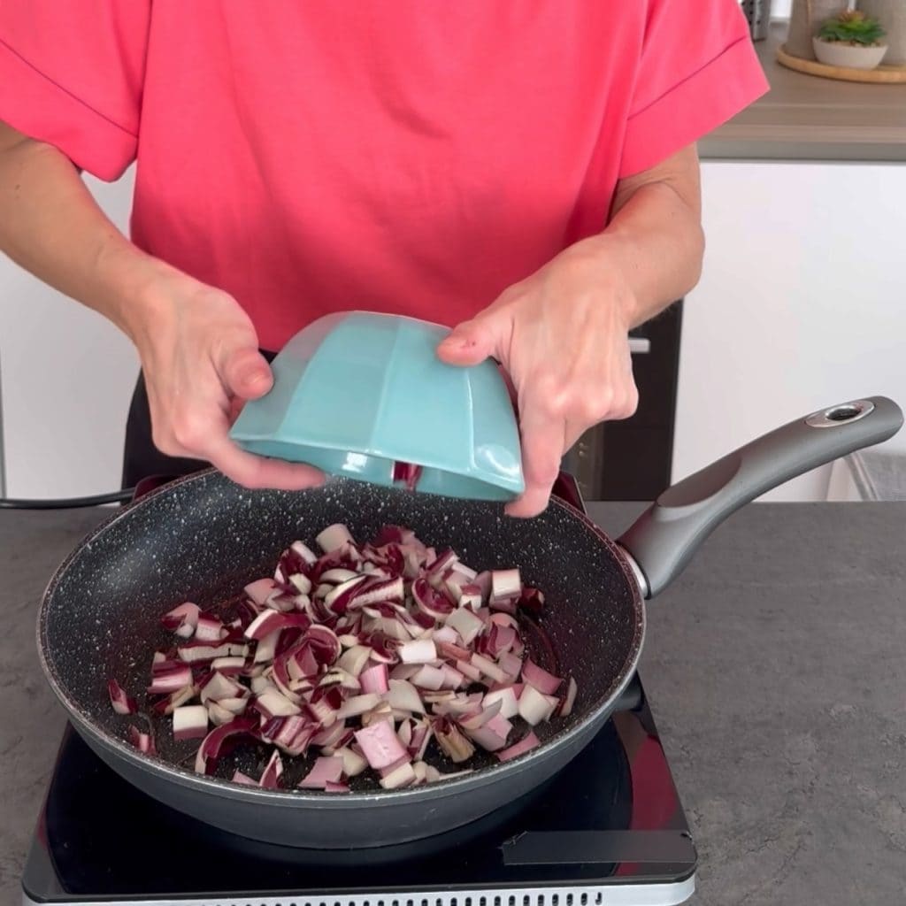 y añade el radicchio que cocinarás durante unos 10 minutos hasta que esté suave,