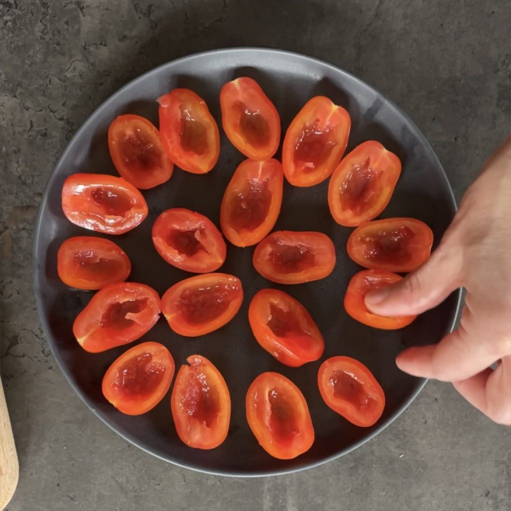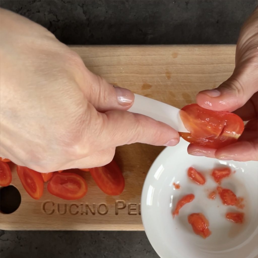 Comenzamos a preparar los Tomates rellenos de atún fríos, lava los tomates, córtalos por la mitad y elimina la parte interna de los tomatitos, ayudándote con un vaciador o con un cuchillo. Puedes usar la parte extraída para hacer una salsa para la pasta, no la tires.