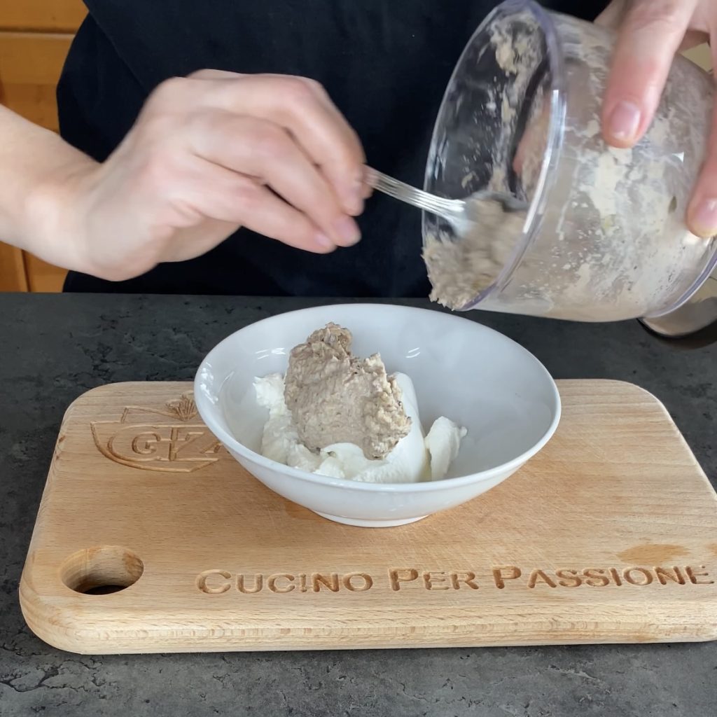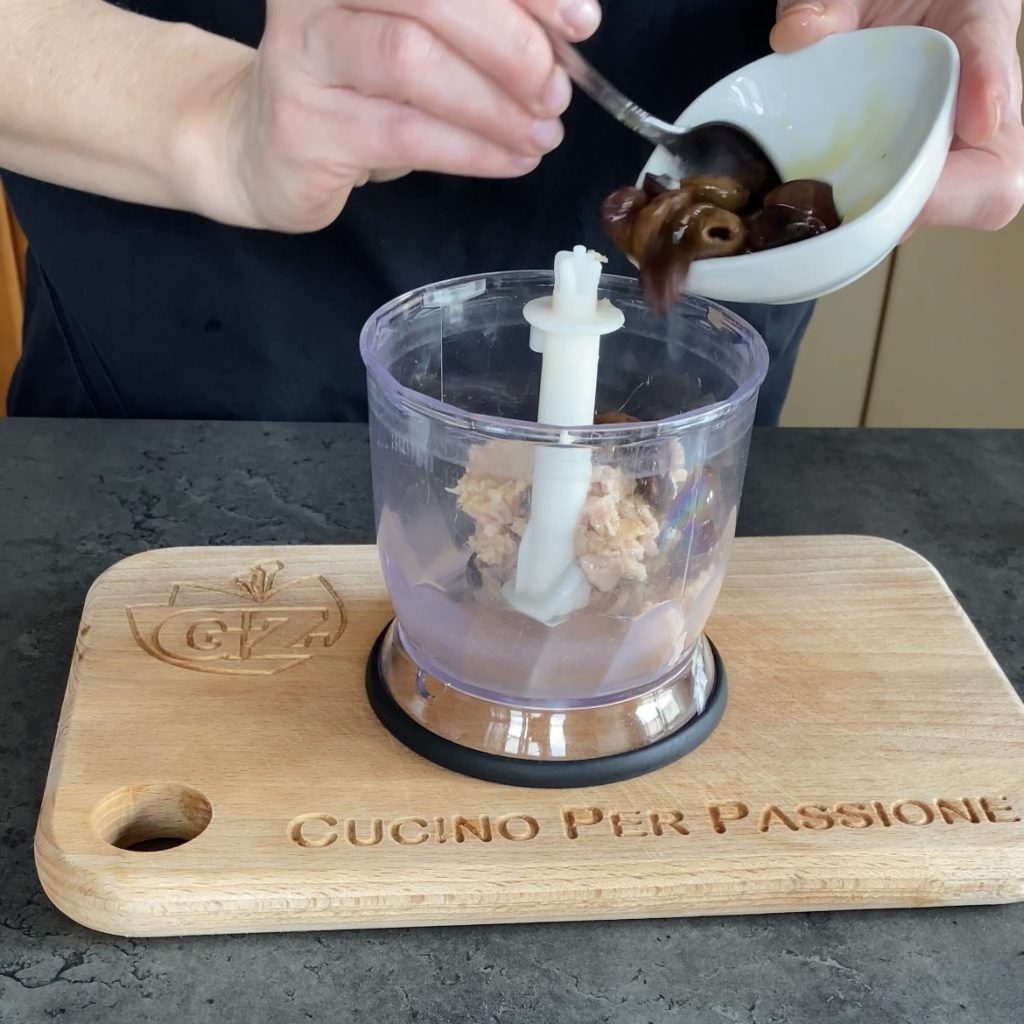 Vierte en un bol la ricotta y añade la crema de atún, aceitunas y alcaparras recién preparada.