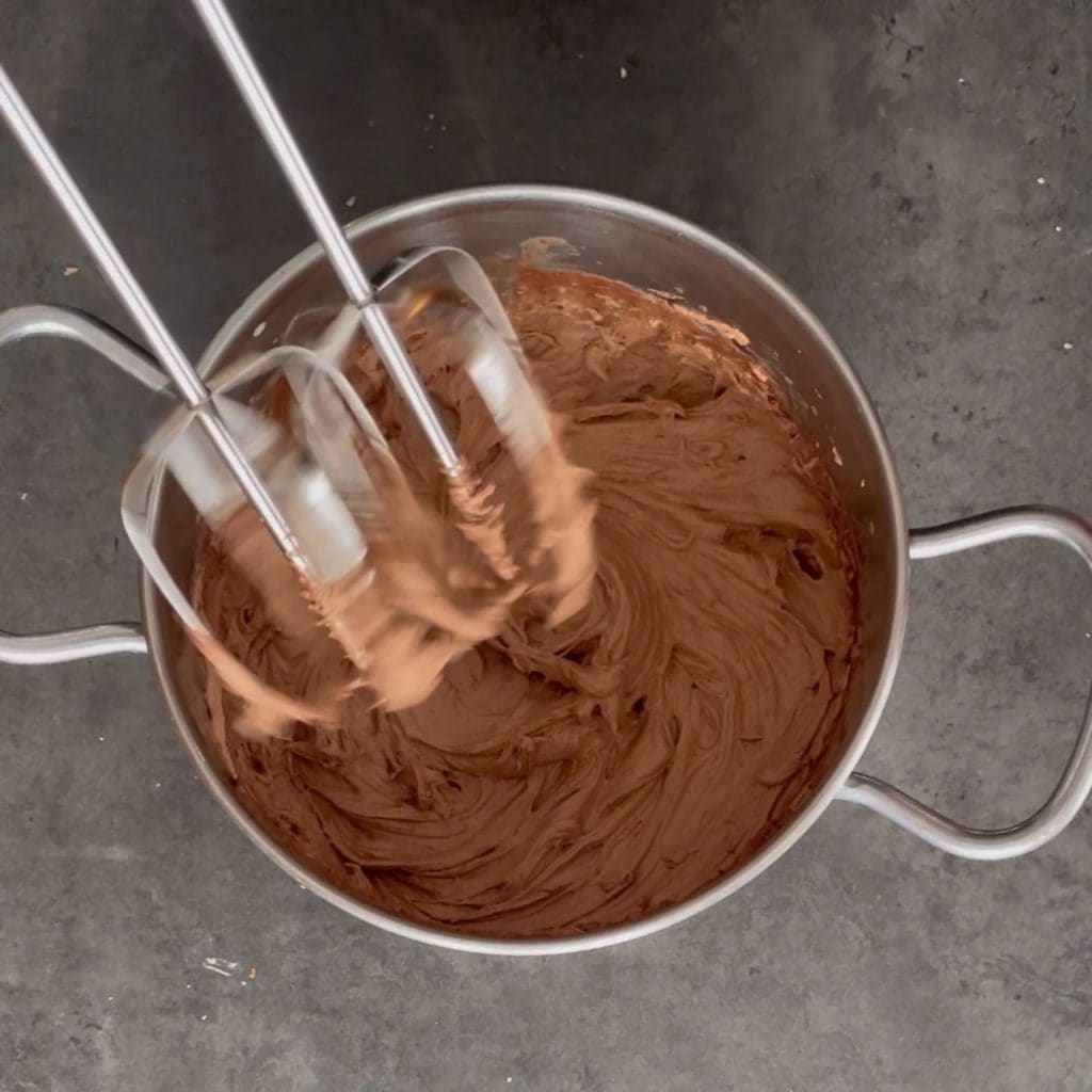 • Después de 30 minutos, recupere la nata y el chocolate del frigorífico y móntela con las varillas eléctricas hasta que se vuelva esponjosa y clara,