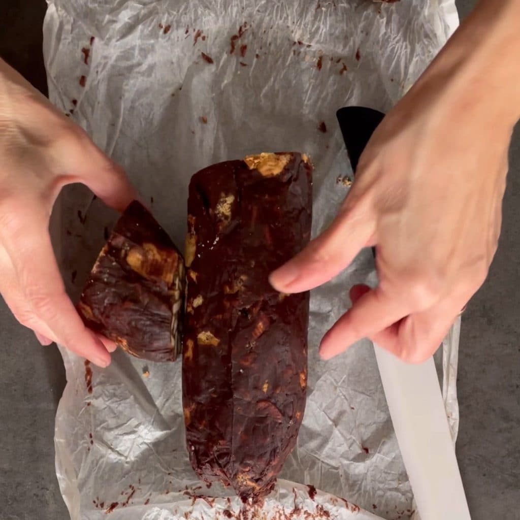 • Tome el salami de chocolate y corte un extremo en forma oblicua,