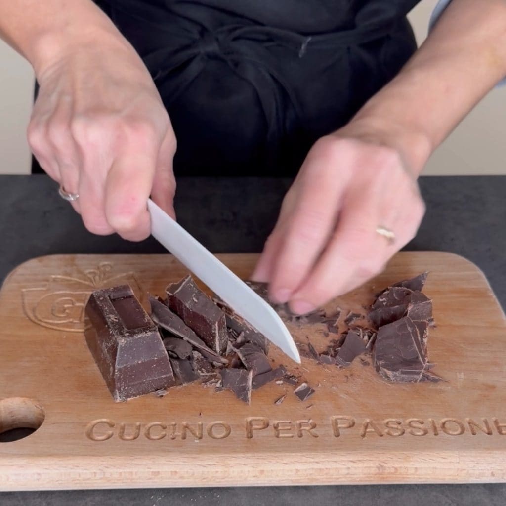 • Prepare ahora la ganache de chocolate, triture los 100 g de chocolate negro,