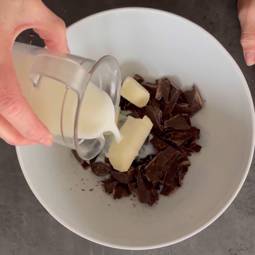• y la leche, derrita en microondas durante 2 minutos a 600 W, si no tiene microondas, primero caliente la leche y luego, cuando esté caliente, añada la mantequilla y el chocolate en trozos y revuelva hasta que se derrita completamente.