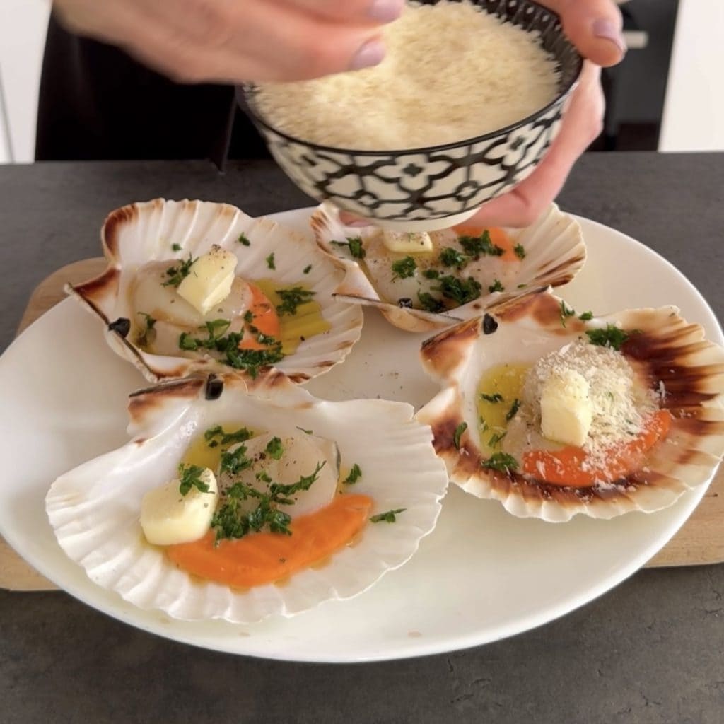 Vieiras en freidora de aire, un entrante de marisco fácil de hacer y gracias a la cocción en freidora de aire tomará poco tiempo. Por favor, prepara el pan para mojar en la salsa. Las vieiras gratinadas en freidora de aire son perfectas también para grandes ocasiones. Yo he usado vieiras frescas, pero como alternativa podéis usar también vieiras congeladas. Os aconsejo mirar también otras recetas de VIEIRAS para cada ocasión. Ahora vamos a ver cómo hacer las vieiras en freidora de aire y si las probáis, contádmelo. Barbara