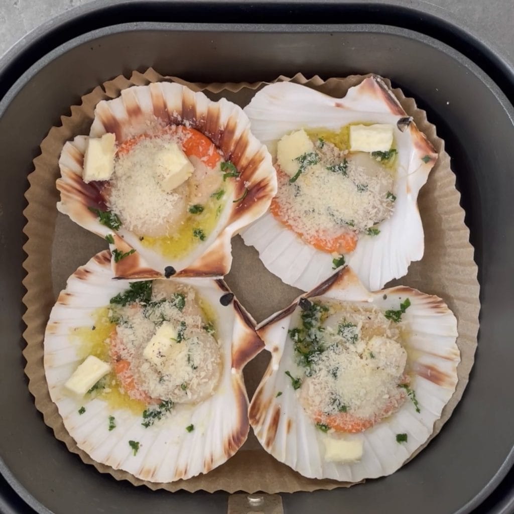 Una vez que las Vieiras en freidora de aire estén listas, retíralas del cestillo de la freidora de aire y sirve bien calientes.